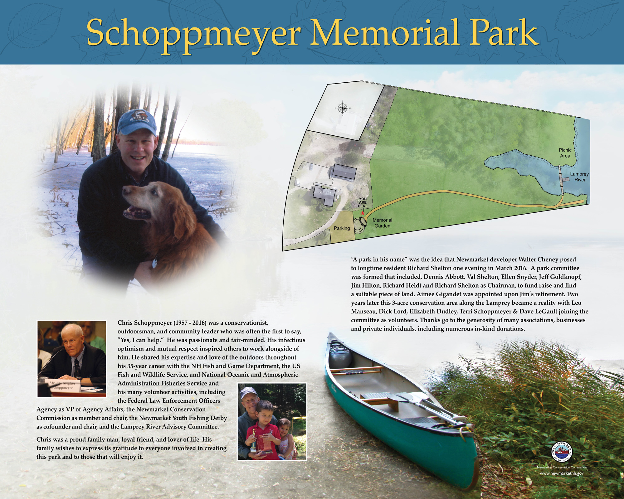 Chris Schoppmeyer was an important man in Newmarket, serving on the conservation commission and organizing the annual fishing derby. “Nature Boy” or “Schoppsie” was a trusted colleague and leader in federal law enforcement, serving 35 years as a conservation officer. He accomplished much and touched many through his dedication to what was legally right, socially good, and often, just plain fun. He was a great man with enormous character who left the best of himself with others. Although his life ended too soon, his memory lives on in the stories of family, friends, and colleagues. And now his memory will live on in perpetuity nestled in a beautiful little park.