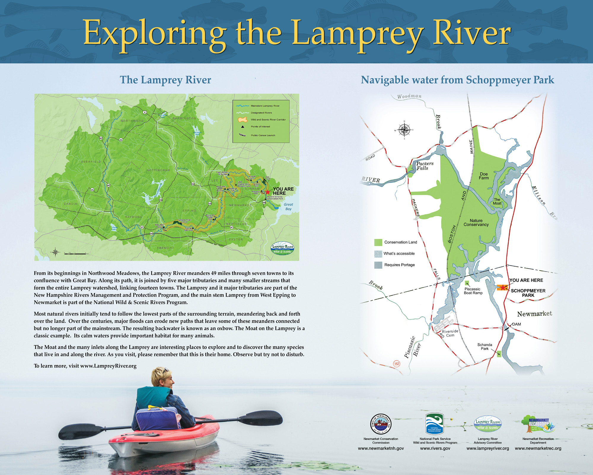 The Lamprey River Advisory Committee was pleased to offer financial and artistic assistance to create this special place. Elizabeth Dudley, landscape architect and LRAC representative, generously designed the contemplative space near the entrance to the park. LRAC representative Dick Lord designed the Lamprey River panel and assisted with layout for the memorial panel.